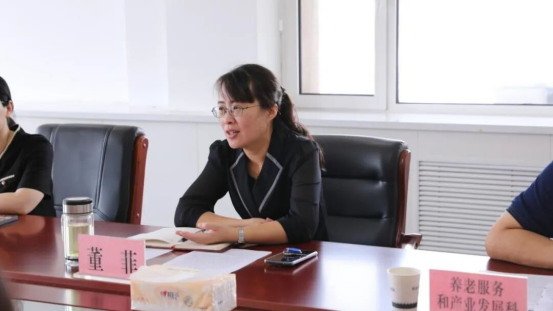 会议伊始,董菲对我院一行人的到来表示热烈的欢迎。她首先指出了目前人口老龄化的严峻现实问题,并表示应加大对养老服务产业的扶持力度,不断创新养老产业发展模式,加强政府的补贴力度,适时进行调研活动来了解老人所需。同时做好承接吸引京津老人来河北养老的工作,促进养老服务产业体系的高质量发展。董菲的讲话为我院社会实践小分队指明了调研的方向和侧重点,为后续具体工作的开展起到了引路灯的作用。