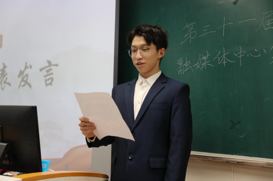 随后,优秀部门代表、学生会主席柳淞森发言,他首先向新加入的学生干事致以热烈欢迎,对第三十届团学融的工作成果进行简要回顾;同时着重提出,新学年要进一步强化部门协同、凝聚团队合力,以更高标准、更实行动为学院的发展注入青春动能。