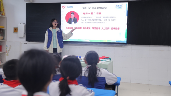 活动伊始,我校宣讲团通过播放九三阅兵中核导弹方阵的视频,激发了同学们对核事业的浓厚兴趣。随后,志愿者们用通俗易懂的语言,讲述了钱学森、邓稼先、于敏等“两弹一星”元勋的感人事迹,将枯燥的背景知识转化为生动故事,并通过双方互动等形式,深入阐释了“两弹一星”精神的内涵。孩子们聚精会神,踊跃参与,现场气氛热烈。