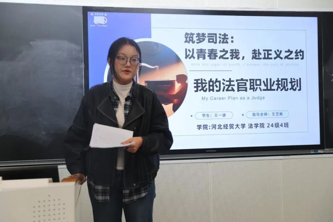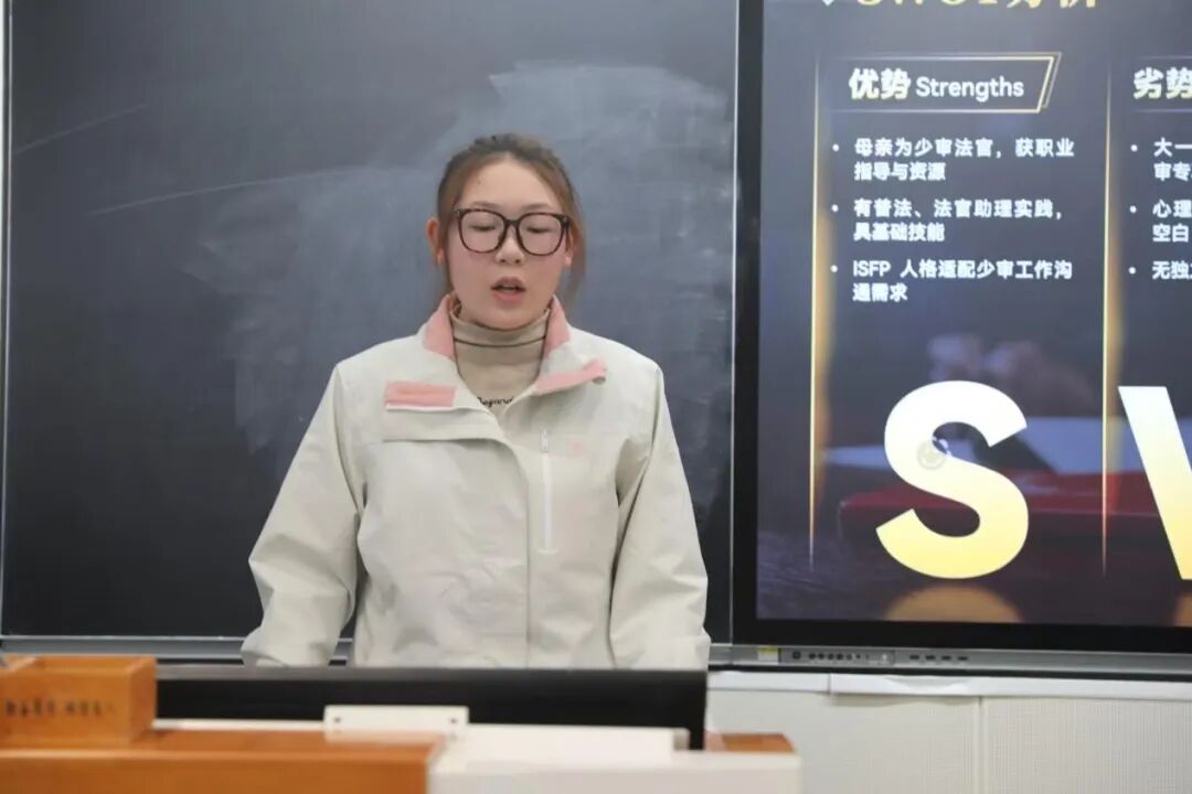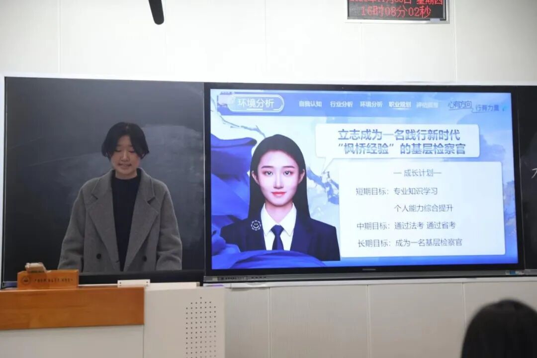 前辈引路,后浪奔涌。选手展示环节亮点十足,成为大赛核心看点。参赛学子们聚焦具体职业方向,用动态数据模型直观呈现岗位进阶路径;针对法考备战、实习选择等关键节点,配套详实的风险评估与应对方案;不少选手拆解短期考证、中期实习、长期晋升的具体目标,逻辑清晰、落地性强。大家自信从容的表达、求真务实的规划,充分展现了法学院学子的专业素养与青春风采,赢得现场阵阵掌声。